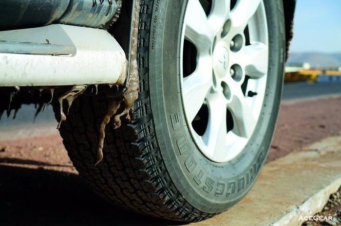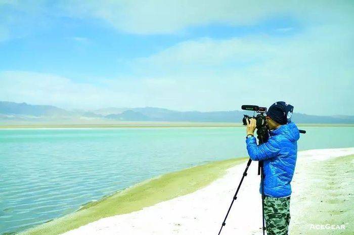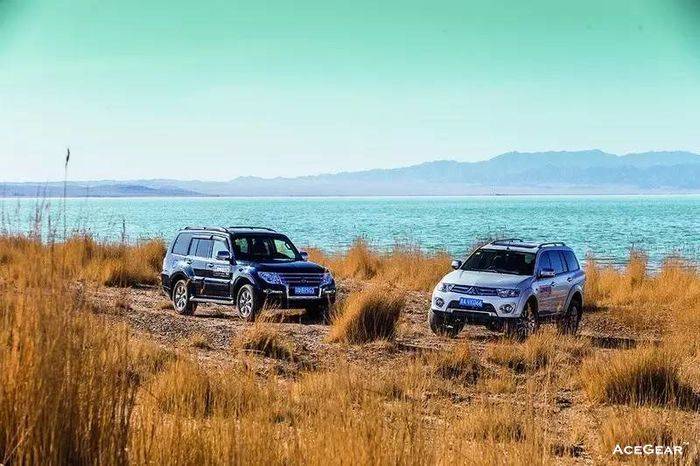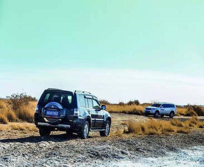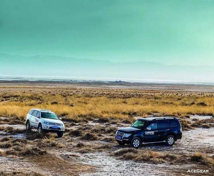 在德小高速与柳格高速交接的地方,我们发现了路边的小柴旦湖,这又是一个咸水湖,远眺好似一面镜子,走进了一看美不胜收。由于在湖边走错路线,我们的帕杰罗轮胎被扎漏气了。无奈之下我们只好草草结束拍摄,开始忙活起了换胎。自从帕杰罗从80年代推出以来,它的备胎就是挂在尾门上的,论情怀绝对专一。这样悬挂备胎的好处也显而易见,取放都很方便,不会把车内行李厢弄得一团乱。