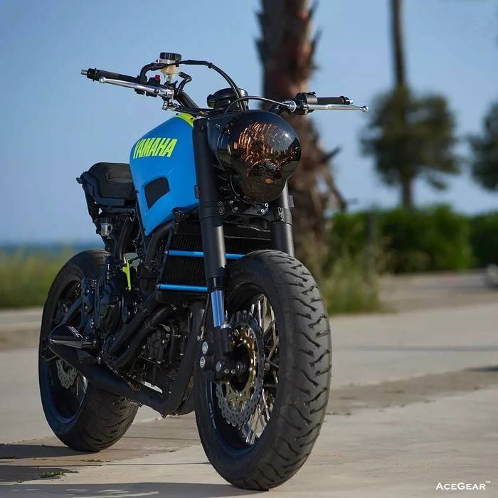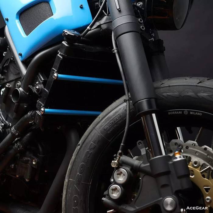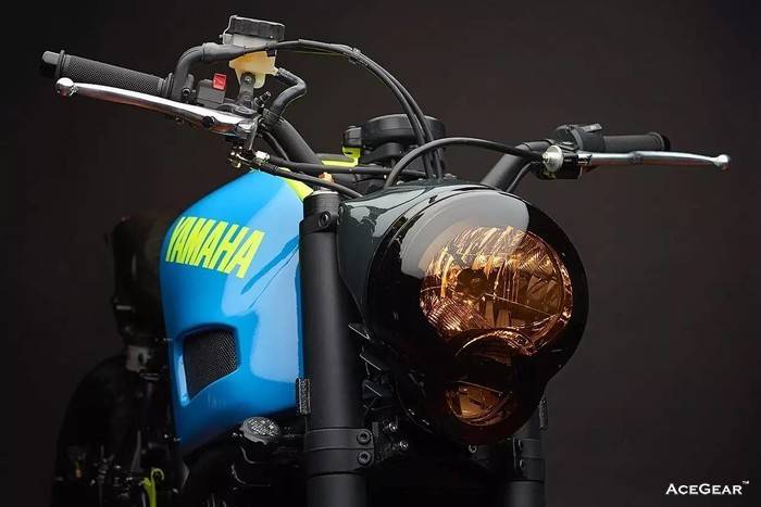 David 彻底重做了 XSR 的比例,从前部开始,他将雅马哈 YZF-R6 的前叉、卡钳,包括刹车拉杆和离合拉杆全部移植了过来。