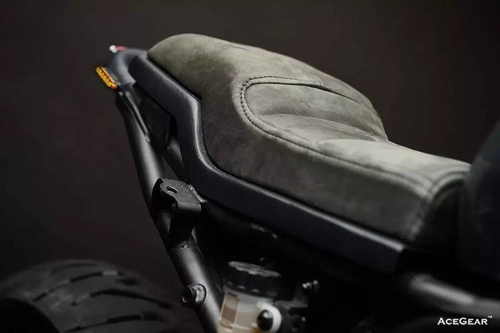 虽然 xsr700 车架后部是可移动的,但David还是自己另外做了一个新的。新的 LED 尾灯和转向灯,新的布线。圆滑的牛皮鞍座比原装位置高了15mm,Gears Racing 的减震器也比原装减震长一点点。