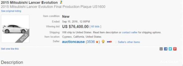 同期出售的还有最后一代三菱Evo。最后1600辆中的第一辆在这个月在美国ebay上进行了拍卖,经过长达一个星期的竞拍,最终成交价为76400美元。拍卖所得收入将全部捐献给慈善组织。