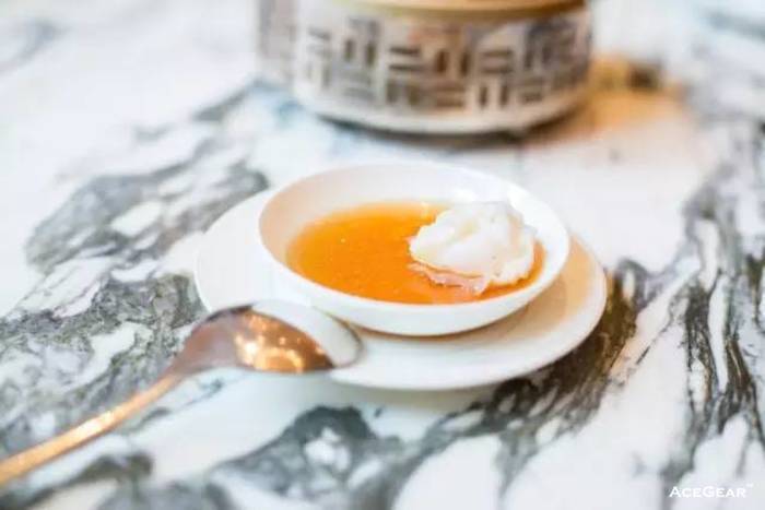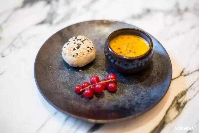 这个玫瑰酒酿饼为雍颐庭自创,属于苏式甜品。内馅的玫瑰酱来自苏州,厨师们发挥了一点小创意,把酒酿给加进去,让口感中充满了玫瑰香的同时,还有一点点淡淡的醉意。南瓜西米布丁则是一道有点西味的甜品,与红加仑一起吃,会碰撞出很有趣的味道哦。