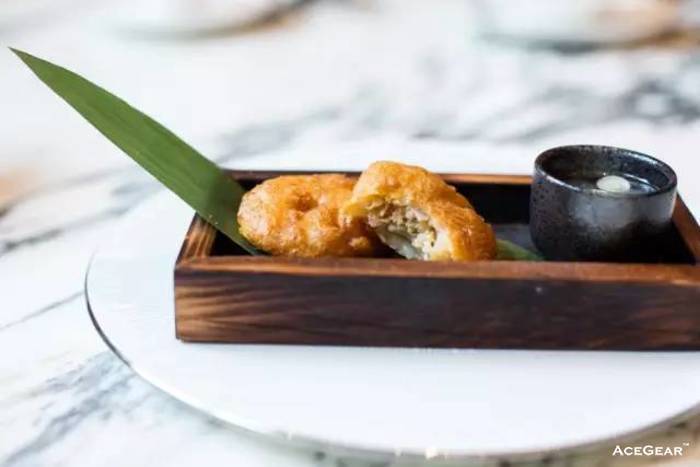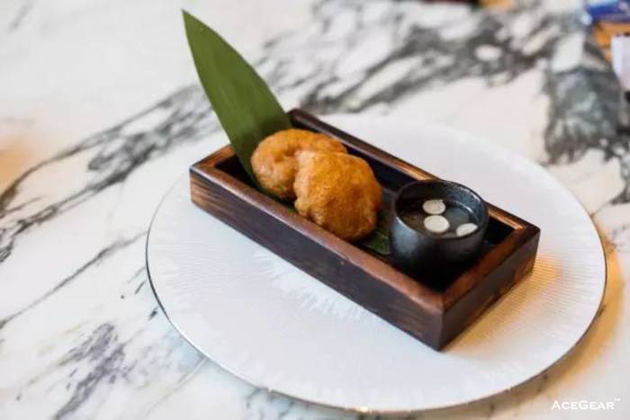 我们探店的时候,正值江南一带品尝大闸蟹的最佳时节,有幸尝到了出自米其林厨师之手的螃蟹。这个蟹盒用了蟹大腿肉,用藕片包裹挂糊,再下油锅炸至金黄;为了解油腻,这道菜搭配了一小盅酸辣清汤,两个放在一起,有一种怀石料理的感觉。