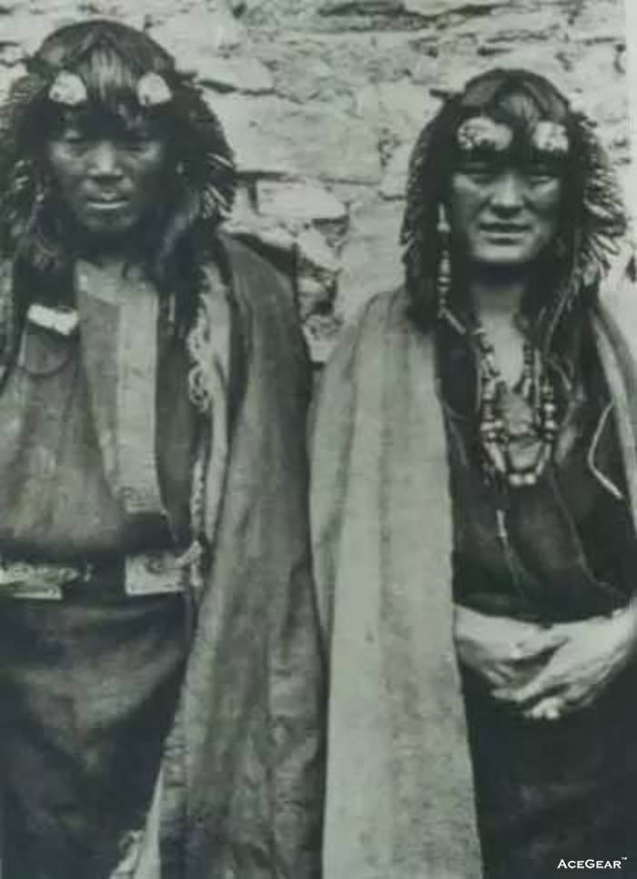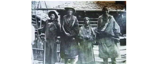 还有一张,照片中的人物有裹着厚重的皮袄、光着脚板、身后背着原始叉子枪的男子,也有高高的个子、身穿长皮袄的女人。