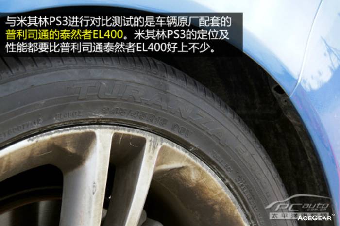 与米其林PS3进行对比测试的是车辆原厂配套的普利司通的泰然者EL400。米其林PS3的定位及性能都要比普利司通泰然者EL400好上不少。