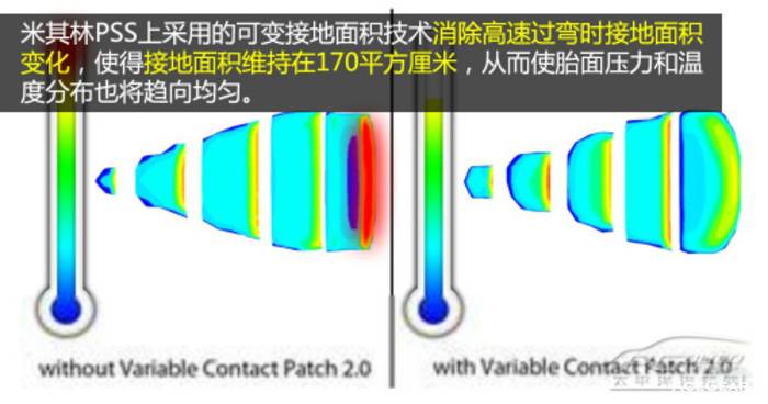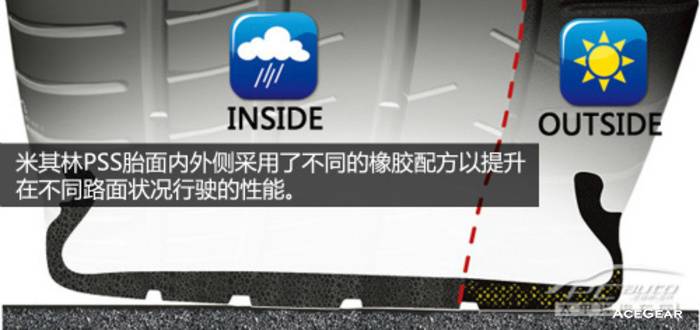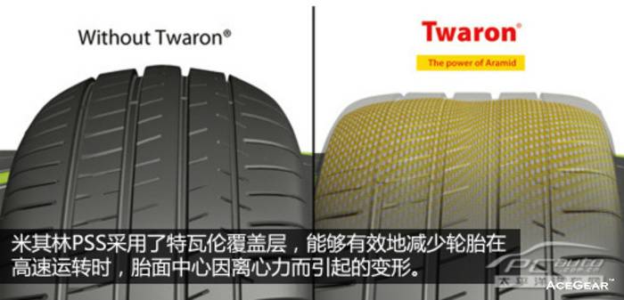 米其林PSS采用了特瓦伦覆盖层,能够有效地减少轮胎在高速运转时,胎面中心因离心力而引起的变形。其次,米其林PSS胎面外侧采用了含碳较多的橡胶配方,拥有更强的操控性及耐磨性;胎面内侧采用了含硅更多的橡胶配方,排水性更好,湿地性能更强。通过对胎面花纹设计的优化,米其林PSS不论在直线行驶还是弯道行驶,胎面接地面积基本不变,这就使得轮胎的抓地力更为稳定。
