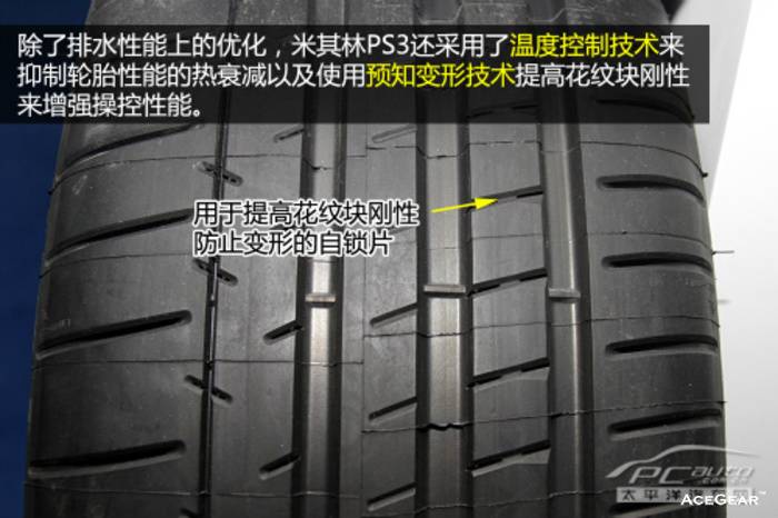 米其林PS3带有温度控制技术,能避免激烈操控时轮胎温升过快,从而改善轮胎性能的热衰减表现。同时,米其林PS3通过提升花纹块刚性来抑制在花纹块在转向时产生的变形,从而提升轮胎的操控性能。米其林PS3胎肩的花纹块设计通过加宽横向排水槽及添加纵向排水槽的方法增强轮胎的排水性能,提升湿地操控能力。