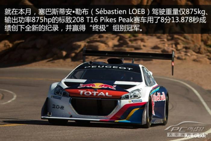 就在本月,塞巴斯蒂安•勒布(Sébastien LOEB)驾驶重量仅875kg、输出功率875hp的标致208 T16 Pikes Peak赛车用了8分13.878秒成绩创下全新的纪录,并赢得“终极”组别冠军。