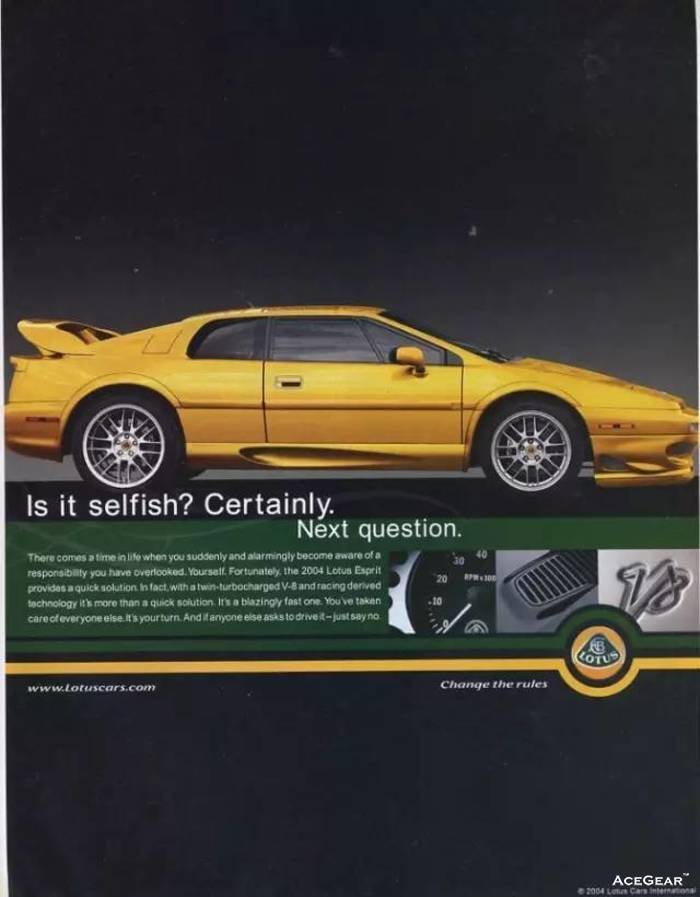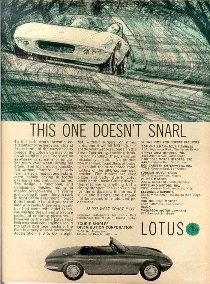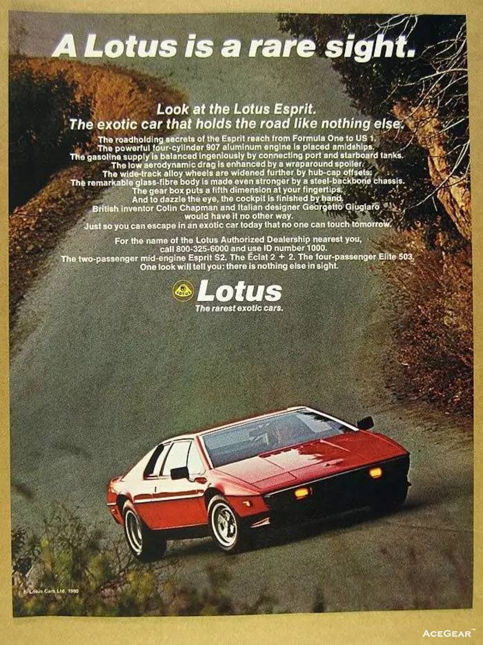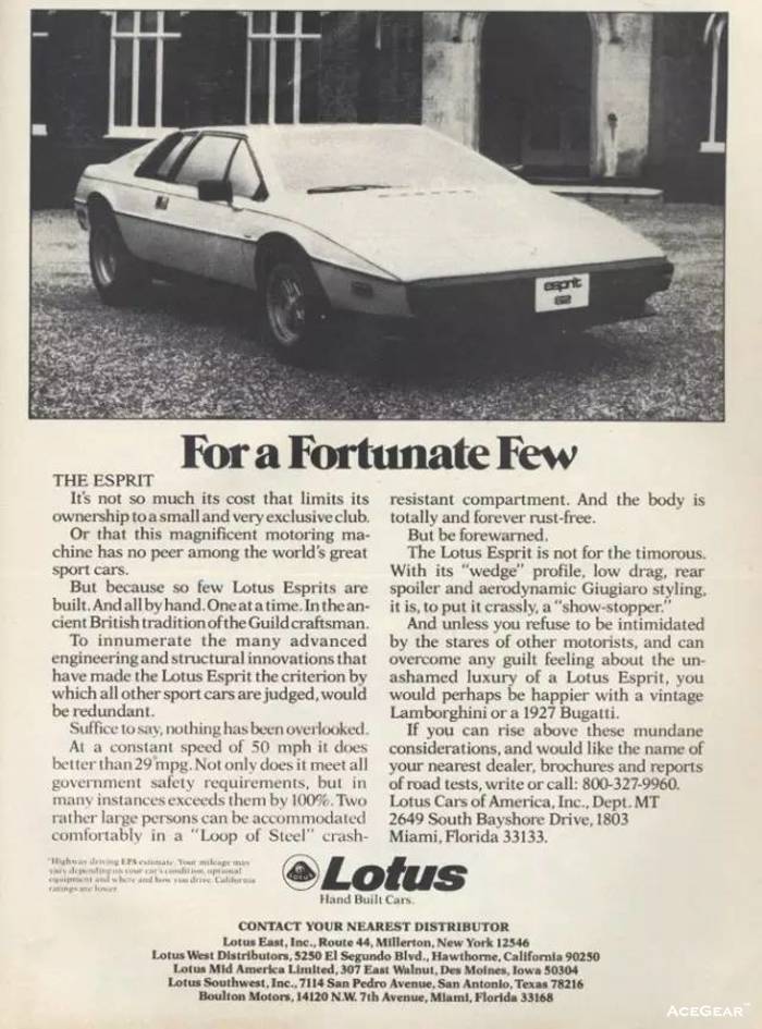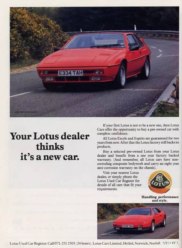 与路特斯的产品一样,路特斯在旧时期的广告也自带“永不过时”的特质。那些60-90年代的路特斯复古平面广告,不论黑白还是彩色,现在看来,不但不乏味,反而带着满满的设计感和时尚气息。让我们一起欣赏路特斯那些Old Fashion的平面广告: